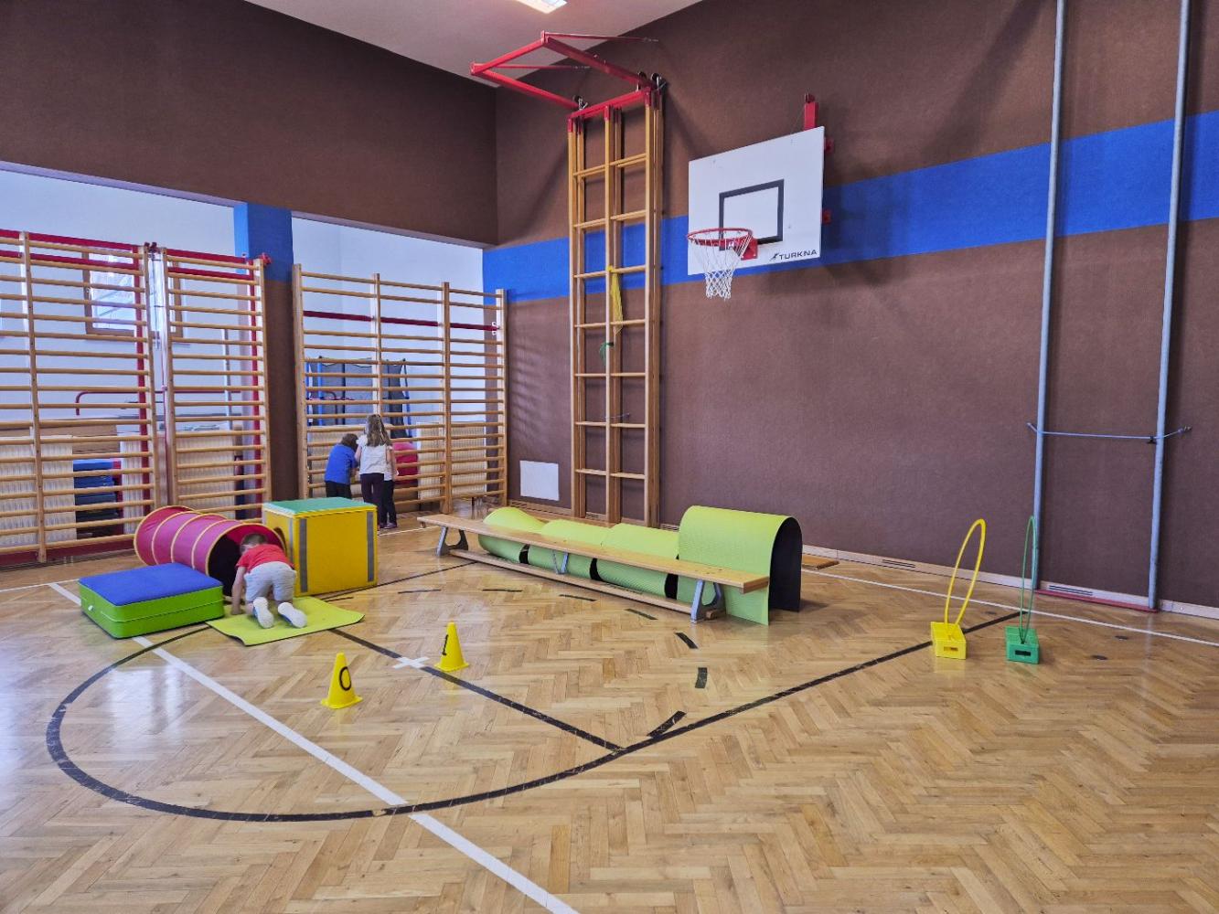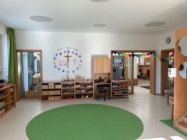 Der Gruppenraum mit dem großen runden, grünen Teppich ist unser Versammlungsplatz. Von hier aus dürfen die KInder in die Spieloase, die Küche oder das Atelier. Gemeinsam wird auch täglich derTurnsaal oder der Spielplatz genützt.